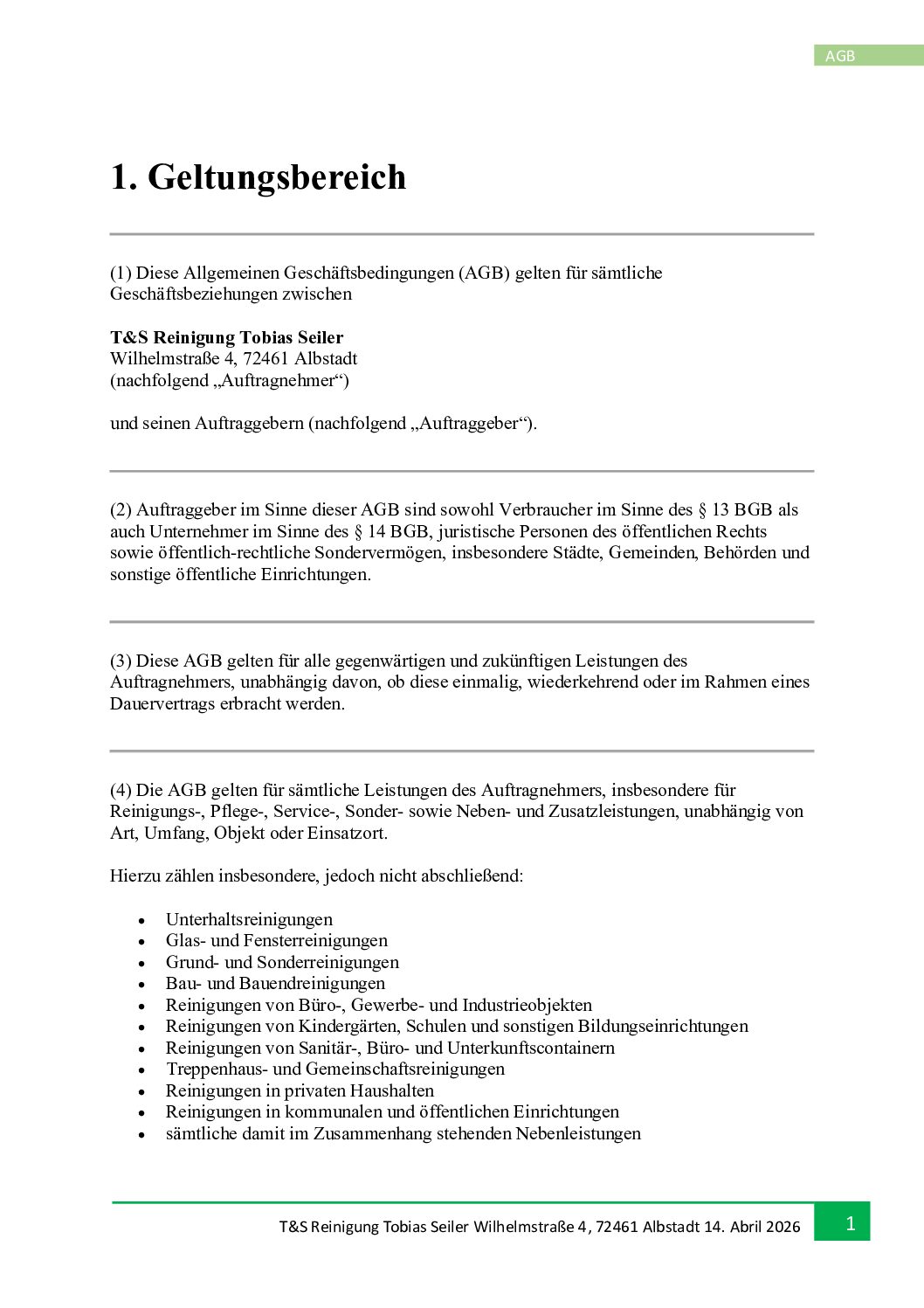 (4) Die AGB gelten für sämtliche Leistungen des Auftragnehmers, insbesondere für Reinigungs-, Pflege-, Service-, Sonder- sowie Neben- und Zusatzleistungen, unabhängig von Art, Umfang, Objekt oder Einsatzort.